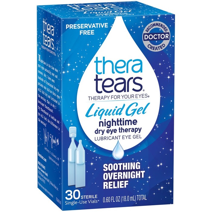 Theratears unique hypotonic and electrolyte balanced formula replicates healthy tears liquid gel formula provides soothing longer lasting relief and protection for nighttime use theratears is just the right thickness to provide less blurring non crusting protective film that is ideal for nighttime use.